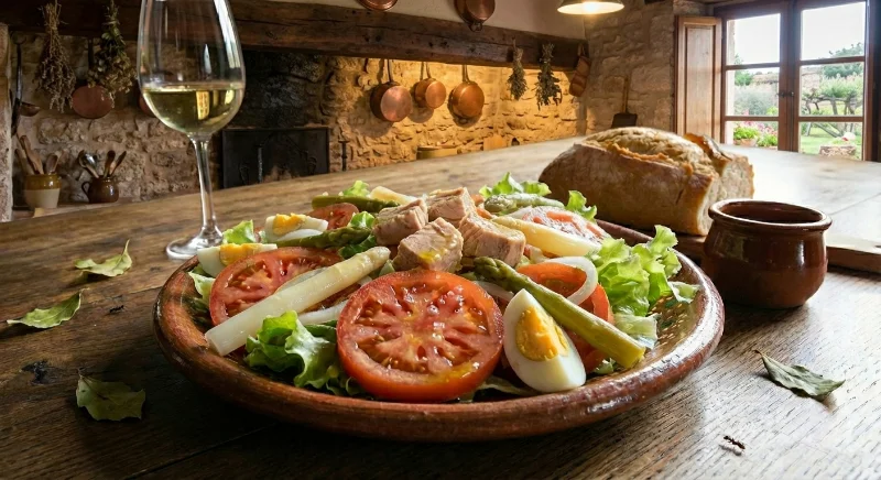 Lechuga, tomate, cebolla, atún, zanahoria rallada, espárragos huevo.